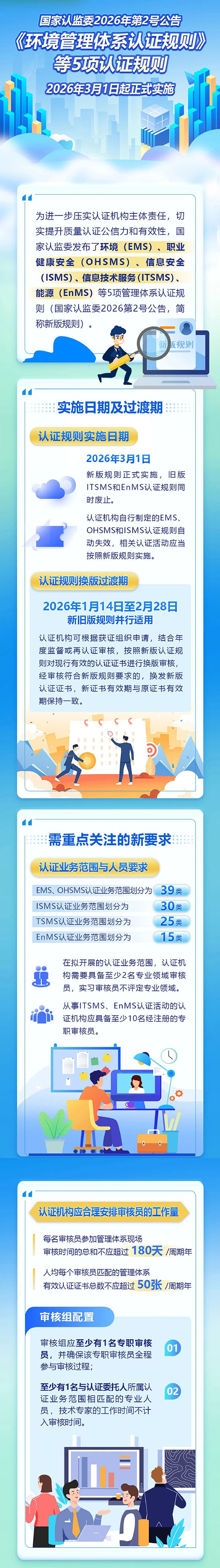 一、自2026 年3 月1 日起,新版规则正式实施,旧版《信息技术服务管理体系认证实施规则》《能源管理体系认证规则》同时废止,认证机构自行制定的《环境管理体系认证规则》《职业健康安全管理体系认证规则》和《信息安全管理体系认证规则》自动失效。
