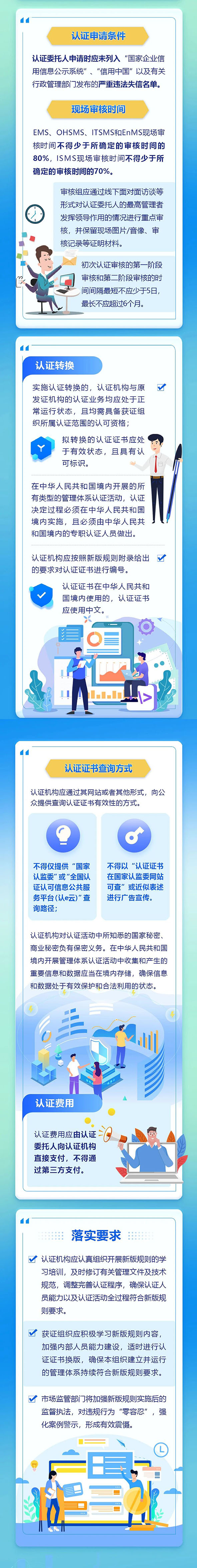 五、获证组织应积极学习新版规则内容,加强内部人员能力建设,适时进行认证证书换版,确保本组织建立并运行的环境管理体系、职业健康安全管理体系、信息安全管理体系、信息技术服务管理体系和能源管理体系持续符合新版规则要求。