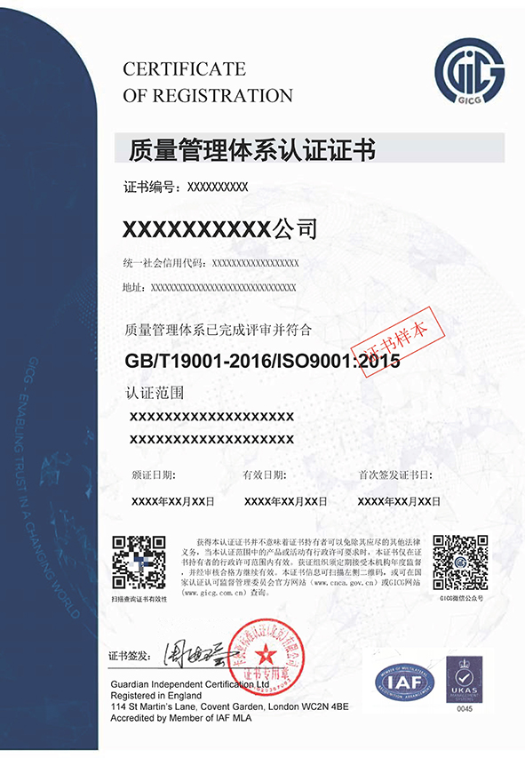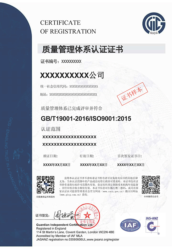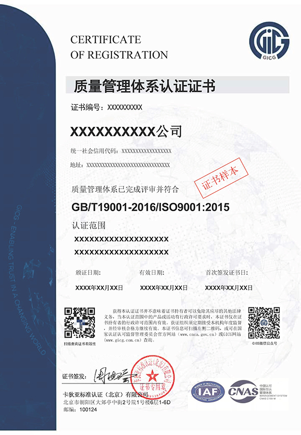 质量管理体系证书样本