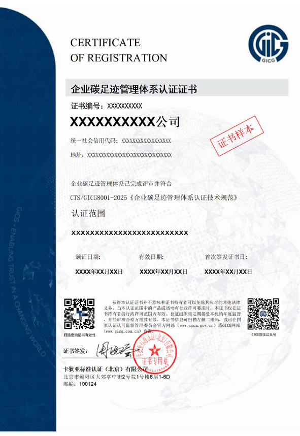 碳足迹管理体系证书样本