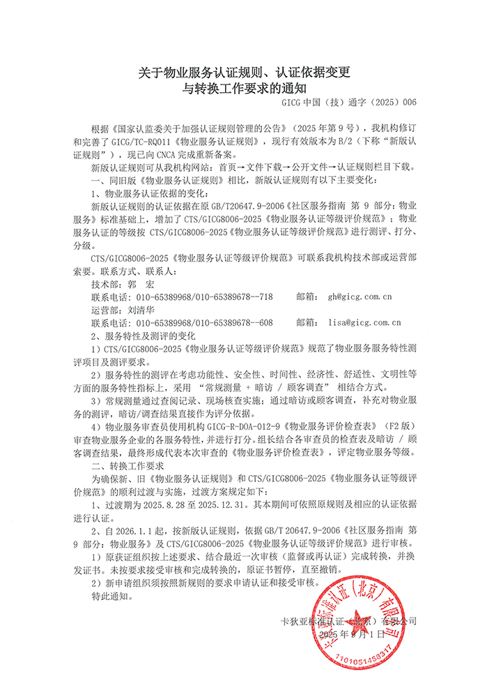 关于物业服务认证规则、认证依据变更与转换工作要求的通知