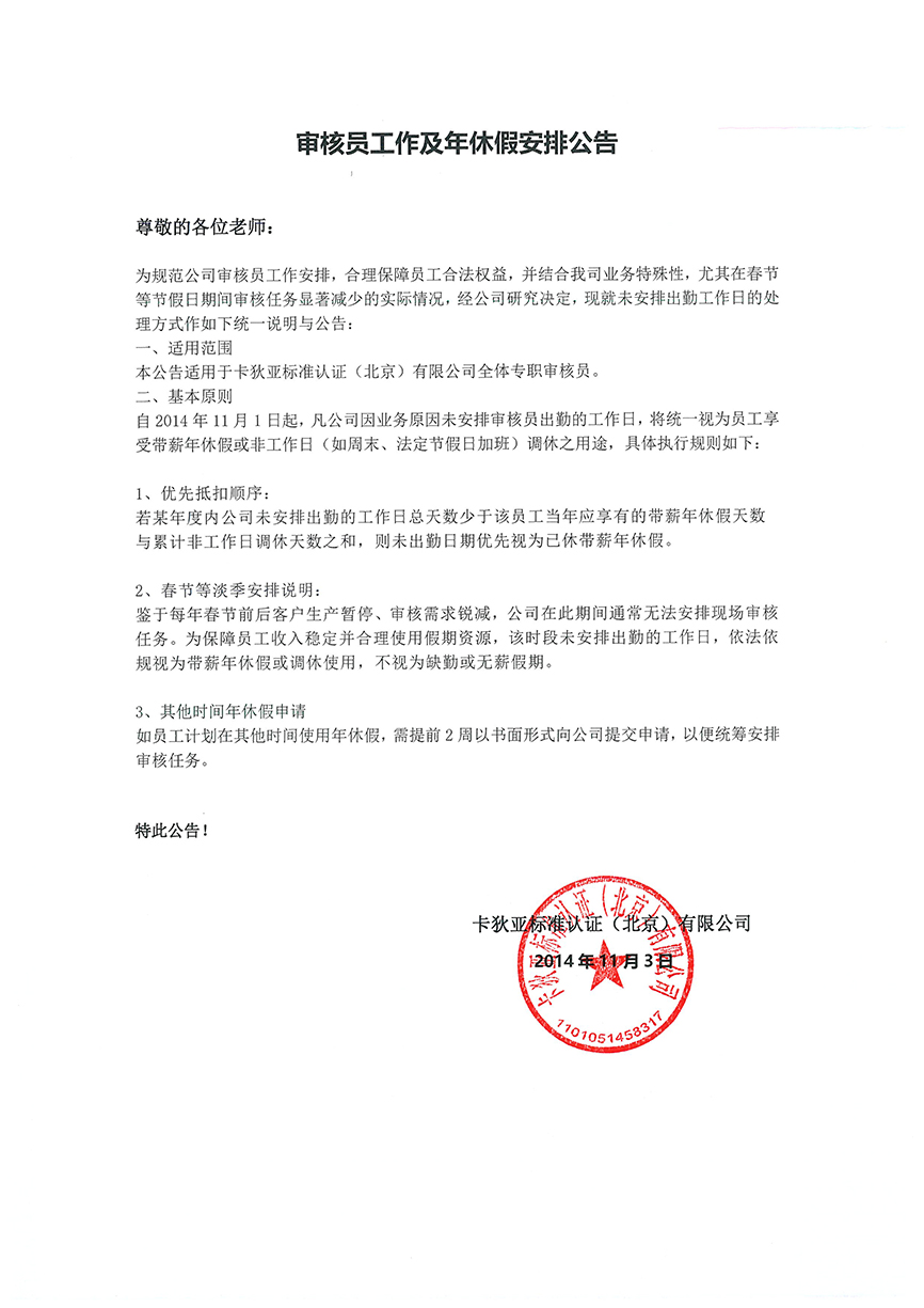 关于审核员工作及年休假安排公告