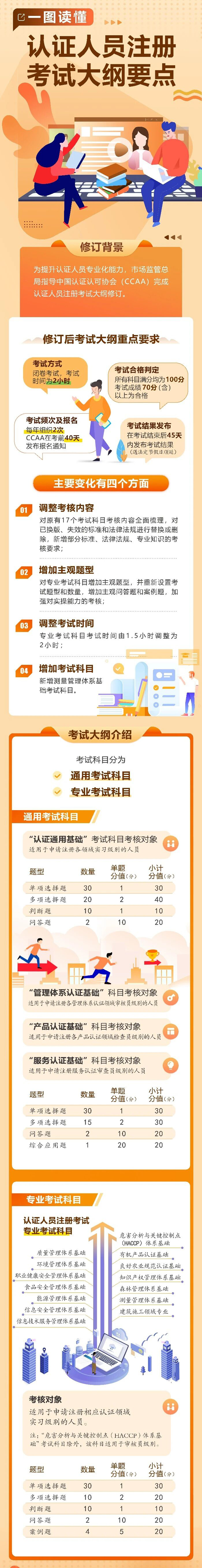 为提升认证人员专业化能力,市场监管总局指导中国认证认可协会(CCAA)完成认证人员注册考试大纲修订,以下“一图读懂”带您了解认证人员注册考试大纲要点。