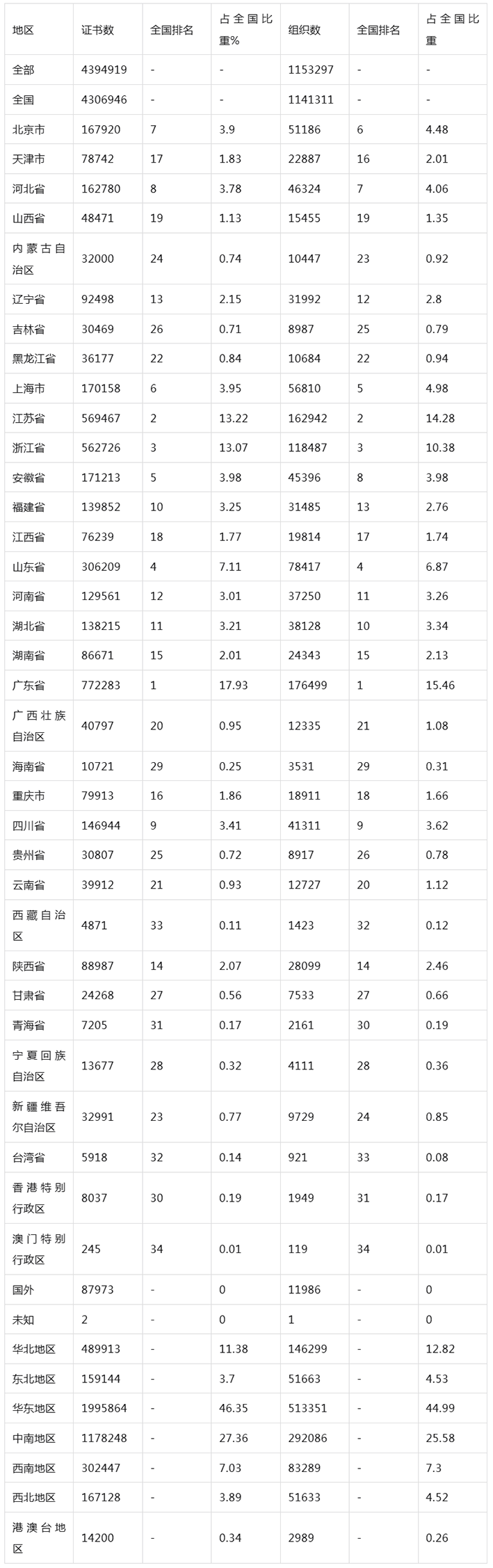 |       近日,从全国认证认可信息服务平台获悉,截至2025年9月,全国共颁发有效认证证书430万张,获证企业114万家。 一、整体概况       截至2025年9月,我国有效认证证书数为430万张,获证企业114万家。其中证书数10万以上的省、市有12个,分别为广东、江苏、浙江、山东、安徽、上海、北京、河北、四川、福建、湖北、河南。       数据显示,从2025年1月到2025年9月,我国证书数超过10万的省市的认证证书数整体呈现增长态势。其中,河北的增长量为14225张,增长率为 9.58%,在12个省市中增长最快。广东、江苏、浙江依旧是证书数排名前三的省份。 二、领域分布 2025年9月 获证证书按领域统计情况       从2025年1月到2025年9月:       管理体系认证:整体来看,管理体系认证下大部分子项目的证书数和组织数都呈现增长态势。其中质量管理体系认证、环境管理体系认证、职业健康安全管理体系认证等增长较为明显,而知识产权管理体系认证的证书数和组织数出现了负增长。       产品认证:产品认证合计的证书数有一定增长,但组织数略有下降。其中自愿性工业产品认证的证书数和组织数都出现了负增长。       服务认证:服务认证的证书数和组织数都有所增长,虽然增长幅度相对管理体系认证较小,但也表明服务行业对认证的认可度在逐步提高。 三、地域分布 2025年9月 获证证书按地域统计情况 |
